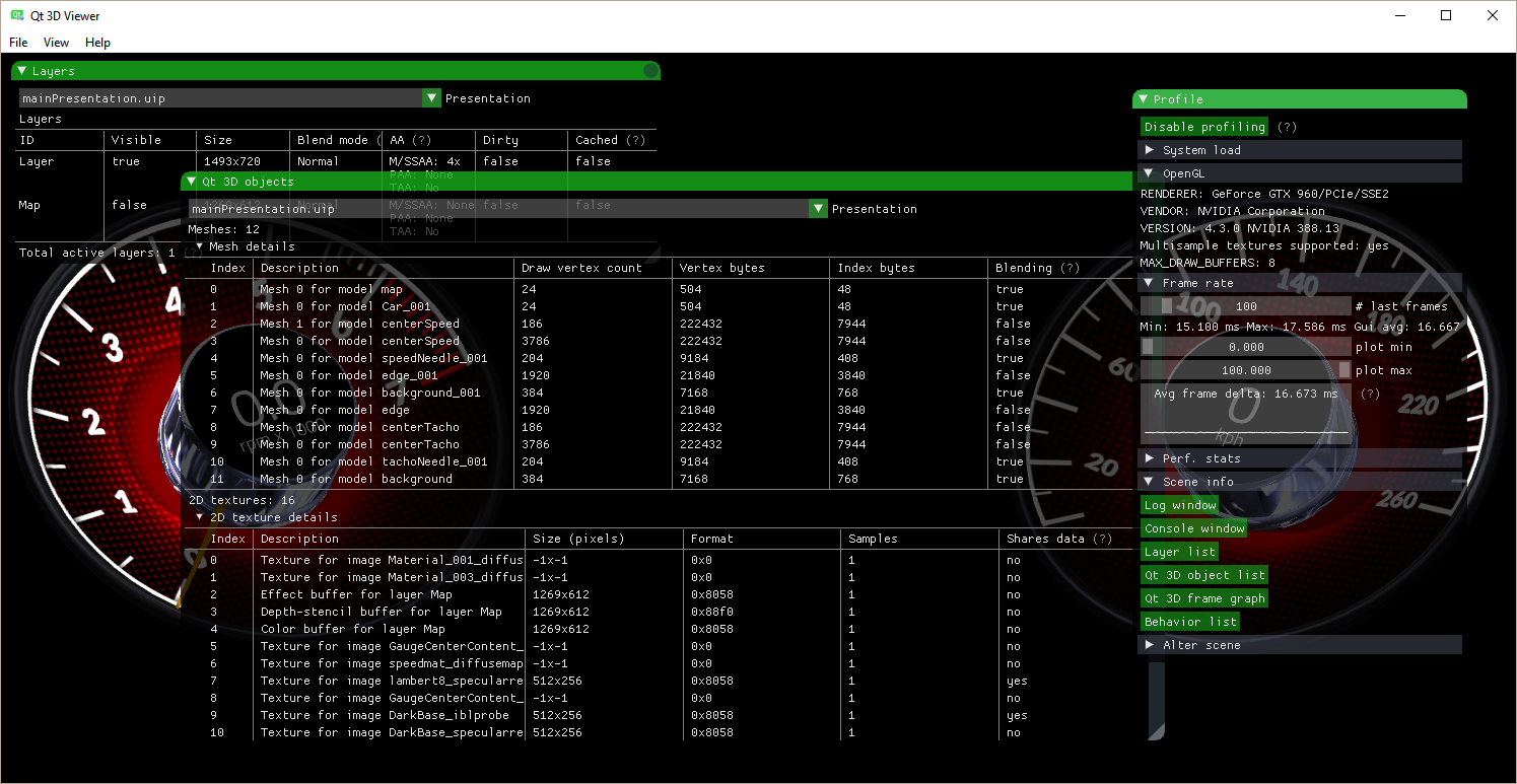 - Qt 3D object list - showing the active list of mesh and texture objects can give an approximate understanding of the graphics resource usage and can also uncover sub-optimal asset situations that lead to degraded performance. For example, having a large number of meshes in the list for a seemingly simple scene should warrant an investigation of the assets as they may be overly complex. Similarly, large textures are often not ideal, yet they may be overlooked during the design phase of the presentation. Here it becomes immediately obvious if some texture map is unncessarily large.