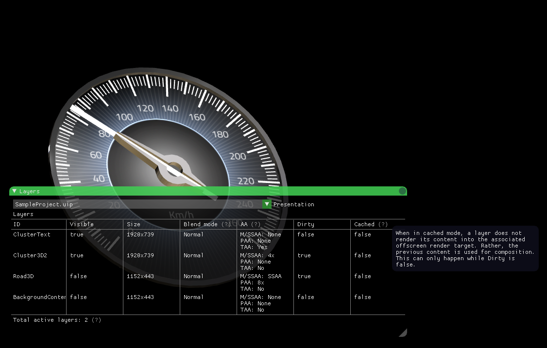 layersin the presentation. A Qt 3D Studio presentations consists of one or more layers which are backed by OpenGL textures each. These are composed together with the appropriate blending mode (and optionally with post-postprocessing effects applied) to get the final output. It is important to understand that each layer corresponds to a separate render target (e.g. an OpenGL texture and the corresponding framebuffer setup) in the engine and is using graphics resources like any other texture map. The performance of the composition is also important, especially on mobile and embedded where the fragment processing power can be more limited. - A filterable log view (with the debug messages that are also printed on the default qDebug output of the platform)