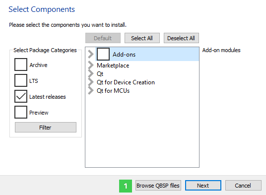 After this, the content of the QBSP is available in the component selection tree. Select the ones you are interested in and finalize the installation.
