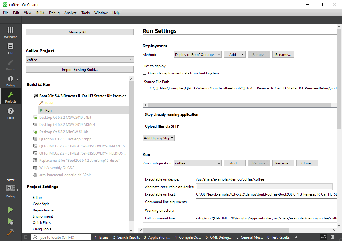 Note: Qt Creator uploads the application over the IP network, so the Renesas R-Car device has to be in the same network as your development host PC.