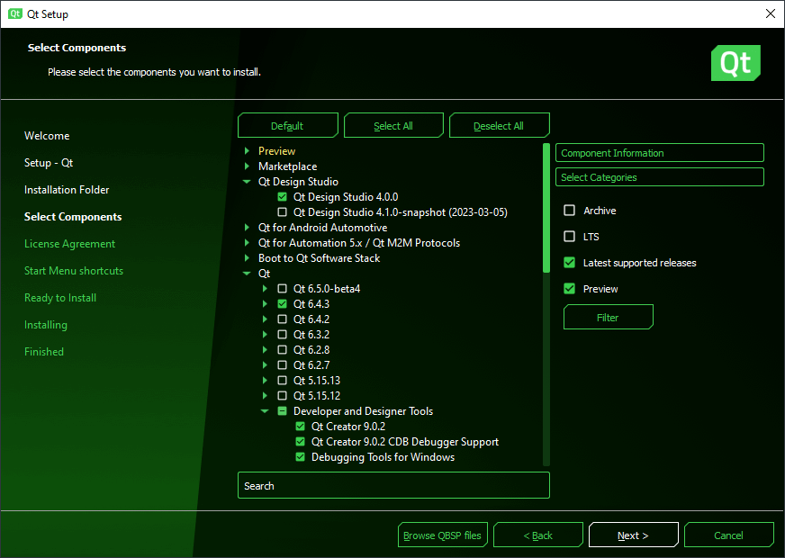- In Select Components, select the latest official release of Qt. The required developer and designer tools (such as Qt Creator and Qt Design Studio) are preselected in the installer.