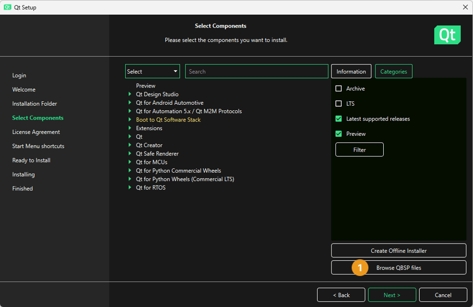 After you have built the QBSP file, you can verify it with the Qt Online Installer. If the QBSP file was successfully created, you can load it into the installer and install the QBSP's content.