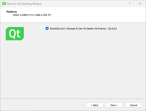 Before flashing the Boot to Qt image to a microSD card, make sure that the target device is compatible with Boot to Qt. Use the firmware files included in the QBSP to update the target device. For detailed instructions, see R-Car H3SK flashing firmware.