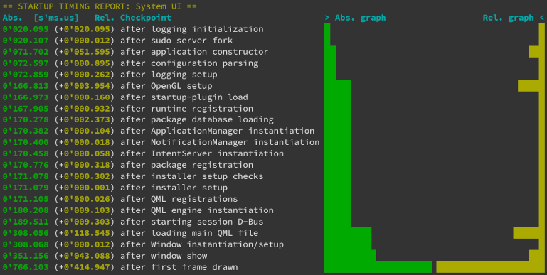 When activated, this report will always be printed for the System UI. If the application manager is running in multi-process mode, additional reports will also be printed for every QML application that is started. Note that the bar widths can only be compared within a report.