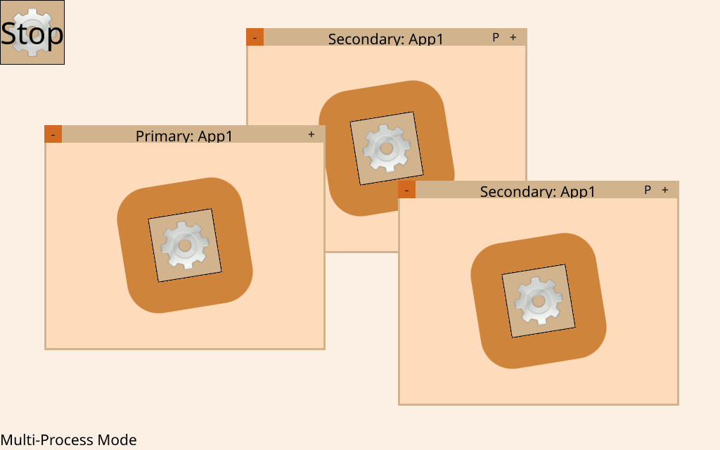 Then, comes the name of the application that created the window, which in this case is App1. On the far left of a window's title bar is a minus button (-) that destroys its WindowItem. On the far right, there's a plus (+) button that creates a new WindowItem and assigns the same WindowObject to it. Finally, for secondary WindowItems, there's also a P button on the right of the title bar that sets the primary property of that WindowItem to true.