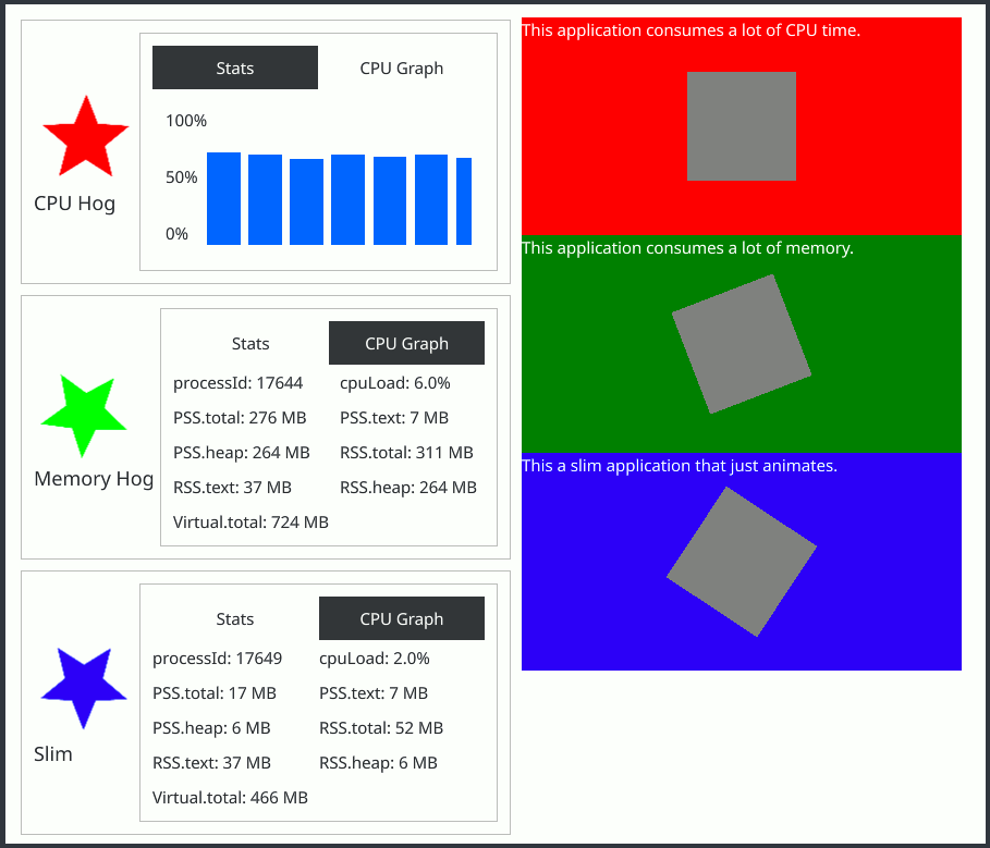 On the left, the built-in applications are listed in a column, where each application has a row that contains its icon and name, next to a tabbed view that shows information about the application's process (if the application is running).