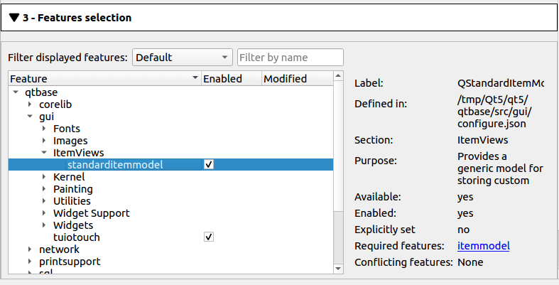 After you have run the configuration, 3 - Features selection lists all the features that are included in the configured modules. In Modules selection, you can enable or disable the Qt modules that are available in the selected source directory.