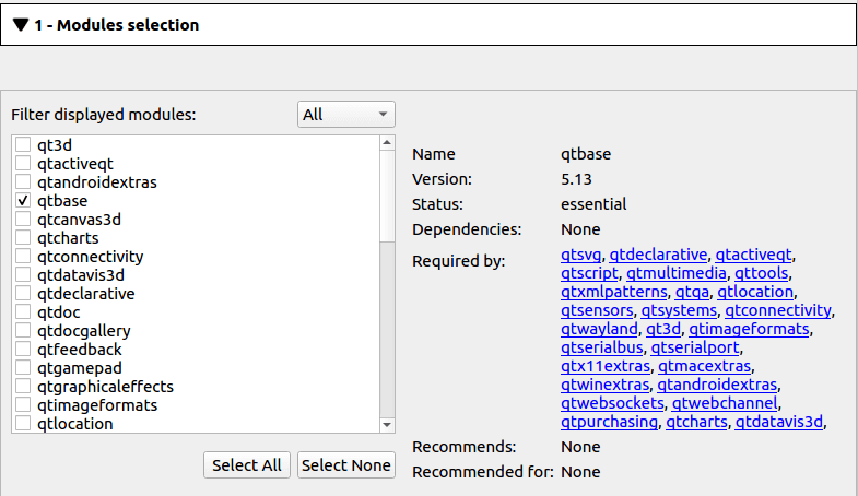 After you have set the build directory, you find the Qt modules under 1 - Modules selection. In Modules selection, you can view all the Qt modules that are available under the selected source directory. In Modules selection, you can enable or disable the Qt modules that are available in the selected source directory.
