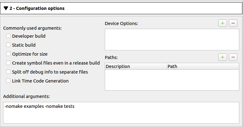 Under 2 - Configuration options, you can modify device options, paths, and arguments for your Qt build.