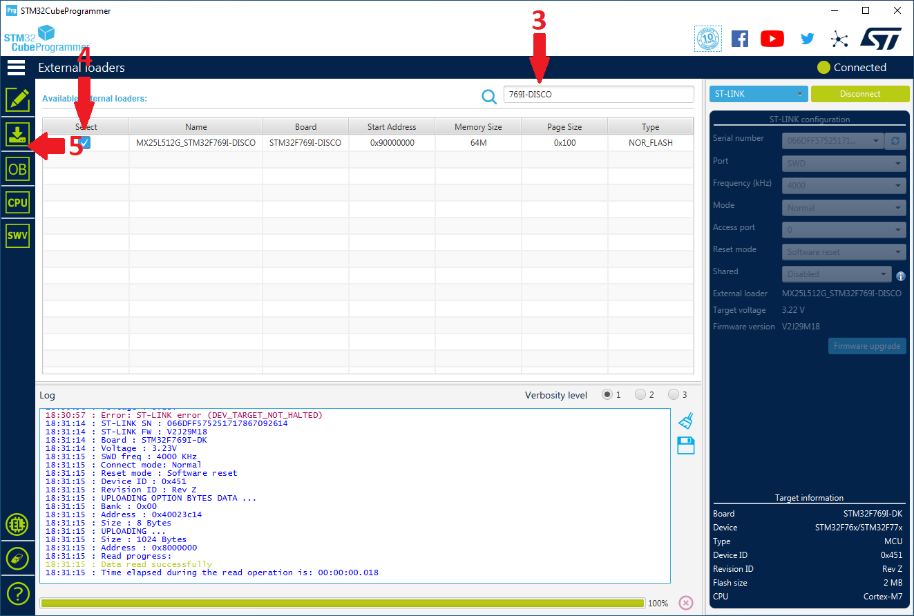 - Choose an appropriate external loader script (for example, MX25L512G_STM32F769I-DISCO)