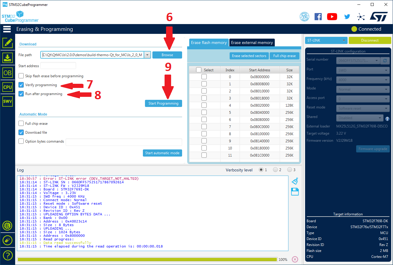 - Select connect to estabilish connection with the onboard ST-LINK Programmer