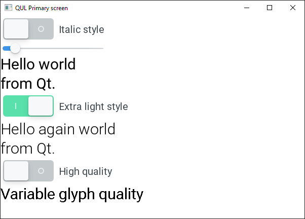 Text { id: lightText text: "Hello again world" font.pixelSize: pixelSizeSlider.value // Depending on the 'lightSwitch.checked' value, the font class // name can be "Roboto" or "Roboto Light". font.weight: lightSwitch.checked ? Font.Light : Font.Normal } Text { // To save the memory resources, the font configurations can be shared // between elements. This happens automatically in the emitted cpp code // when font configuration uses only constant values in font.* bindings. font: lightText.font text: "from Qt." }