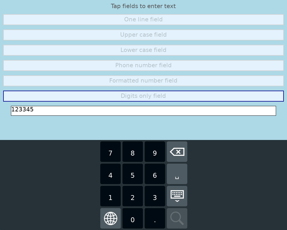CustomTextField { width: parent.width placeholderText: "One line field" enterKeyAction: EnterKeyAction.Next onAccepted: upperCaseField.focus = true } CustomTextField { // ### FIXME - the ShiftKey in default style should get // StyleConfig.capsLockKeyAccentColor color. But state change // for some reason is not triggered in ShiftKeyPanel.qml, even // when InputContext.capsLockActive == true. Bug in 'state' // handling system? id: upperCaseField width: parent.width placeholderText: "Upper case field" inputMethodHints: Qt.ImhUppercaseOnly enterKeyAction: EnterKeyAction.Next onAccepted: lowerCaseField.focus = true } CustomTextField { id: lowerCaseField width: parent.width placeholderText: "Lower case field" inputMethodHints: Qt.ImhLowercaseOnly enterKeyAction: EnterKeyAction.Next onAccepted: phoneNumberField.focus = true } CustomTextField { id: phoneNumberField width: parent.width placeholderText: "Phone number field" inputMethodHints: Qt.ImhDialableCharactersOnly enterKeyAction: EnterKeyAction.Next onAccepted: formattedNumberField.focus = true } CustomTextField { id: formattedNumberField width: parent.width placeholderText: "Formatted number field" inputMethodHints: Qt.ImhFormattedNumbersOnly enterKeyAction: EnterKeyAction.Next onAccepted: digitsField.focus = true } CustomTextField { id: digitsField width: parent.width placeholderText: "Digits only field" inputMethodHints: Qt.ImhDigitsOnly enterKeyAction: EnterKeyAction.Search enterKeyEnabled: digitsField.text.length > 5 onAccepted: { textAreaTextItem.text = textAreaTextItem.text + "\n" + digitsField.text digitsField.clear() }