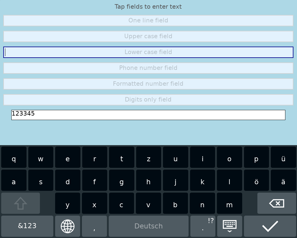 This example demonstrates how to use TextInput in combination with Qt Quick Ultralite Virtual Keyboard (InputPanel) and hardware key input. The application consists of six custom text input fields. The application content can be flicked.