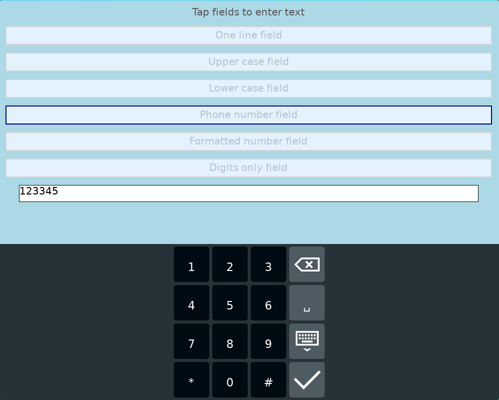 By changing the focus to Phone number field, the Qt Quick Ultralite Virtual Keyboard displays dialpad layout which the application activates by setting the value of inputMethodHints property of CustomTextField to Qt.ImhDialableCharactersOnly.