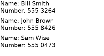 Item { ListView { width: 180; height: 300 model: ListModel { ListElement { name: "Bill Smith" number: "555 3264" } ListElement { name: "John Brown" number: "555 8426" } ListElement { name: "Sam Wise" number: "555 0473" } } delegate: Text { width: 180 height: 30 text: model.name + ": " + model.number } } }