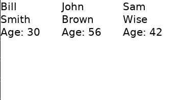 Item { Rectangle { width: 360; height: 200 Component { id: contactDelegate Item { width: 120; height: 200 Column { Text { text: model.name } Text { text: model.surname } Text { text: "Age: " + model.age } } } } ListView { anchors.fill: parent orientation: Qt.Horizontal model: ListModel { ListElement { name: "Bill" surname: "Smith" age: "30" } ListElement { name: "John" surname: "Brown" age: "56" } ListElement { name: "Sam" surname: "Wise" age: "42" } } delegate: contactDelegate } } }