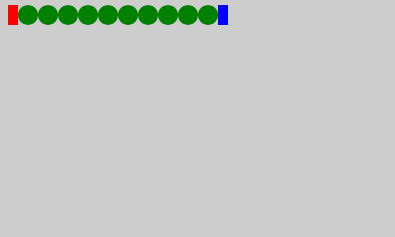 Item { Row { padding: 10 Rectangle { width: 10; height: 20; color: "red" } Repeater { model: 10 Rectangle { width: 20; height: 20; radius: 10; color: "green" } } Rectangle { width: 10; height: 20; color: "blue" } }}