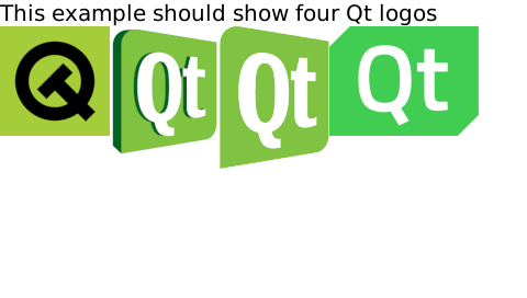 このサンプルは、4つの異なるQtロゴを表示するシンプルな画面(fileloading.qml)で構成されています。一番左の画像はアプリケーションバイナリに含まれる通常のアセットで、他の3つはファイルシステムから読み込まれ、異なるフォーマットで保存されています。