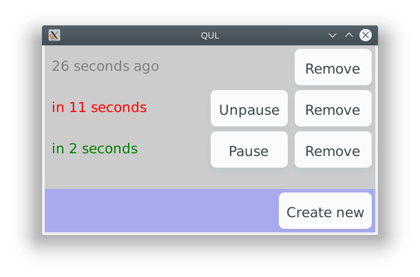 この例では、一時停止、再開、削除が可能なアラームのリストを示しています。Create new ボタンは、選択するごとに新しいアラームを追加します。