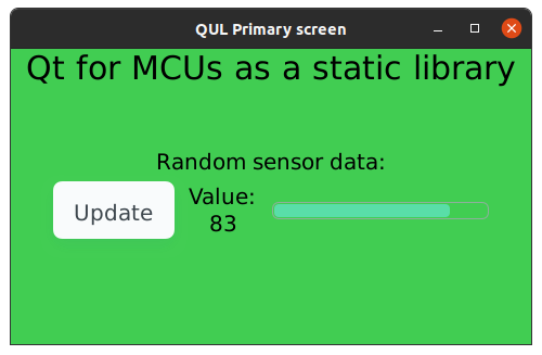 この例では、Qt Quick Ultralite静的ライブラリを作成し、異なるアプリケーションと統合する方法を示します。静的ライブラリとしてコンパイルされたQt Quick Ultralite GUIと、静的ライブラリにリンクする実行可能アプリケーションです。アプリケーションはセンサーデータをシミュレートするためのシンプルなAPIも提供します。Qt Quick Ultralite GUI はこのインターフェースを使用してセンサーデータを受信し、画面に表示します。