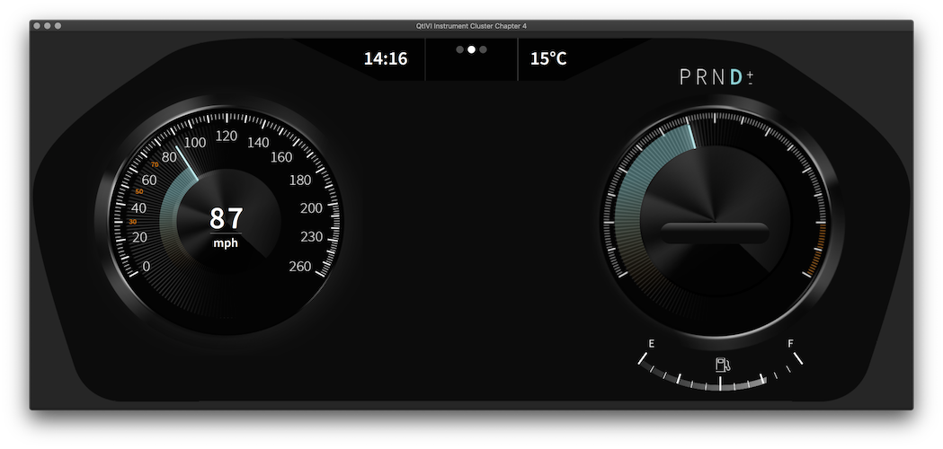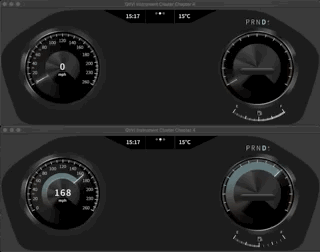 All we need now is the actual integration of the InstrumentCluster QML element and connecting the speed property to the leftDial. This is done by instantiating the element first with the instrumentCluster ID.