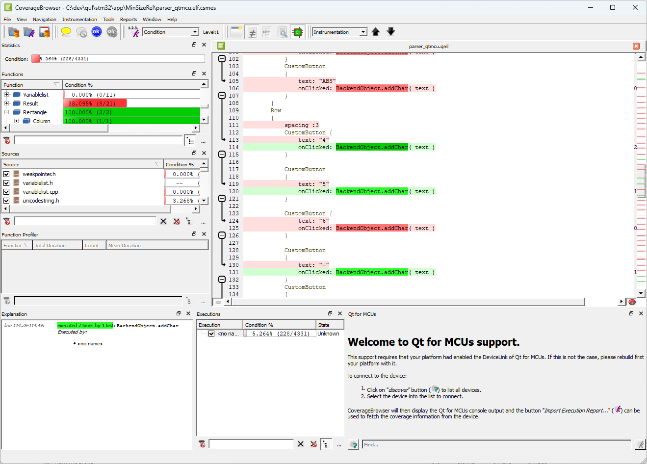 --cs-on: this enables the instrumentation.--cs-mcu: this enables the handling of the DeviceLink in the user application and it uses the memory allocators from Qt for MCUs internally.--cs-off=*.s: this disables the coverage analysis on assembler files.--cs-exclude-file-abs-wildcard=<build_dir>: this permits to exclude the C++ sources generated from QML. The coverage of these sources are covered by CocoQML (see sec:instrumenting-qtmcu-qul-code). The Qt for MCUs installation directory should also be excluded since these system files are not part of the application under test.