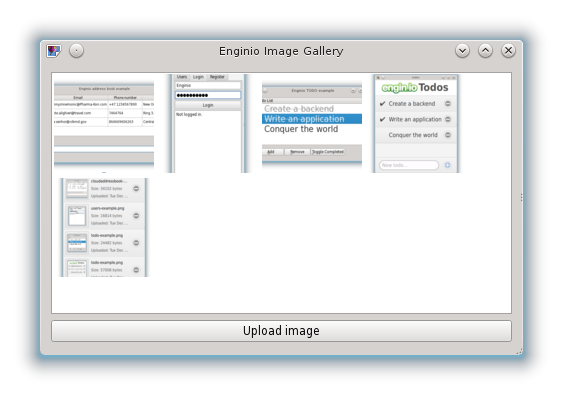 Go to the Enginio Dashboard and create a new backend with the Image Gallery template. The template will construct a new custom backend by executing these steps: