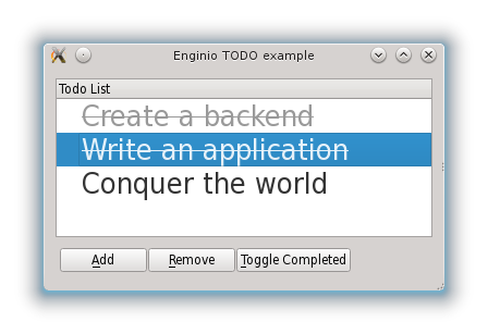 In this example, a list of objects is displayed in a QTreeView. Each item in the list is a Todo object, which can be marked Done or Not done. A Todo can be added, removed, or altered. We will be using the classes and concepts duscussed in Model/View Programming.