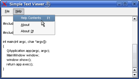 Note: We will only comment on the parts of the implementation that are relevant to the main issue, that is making Qt Assistant act as a customized help viewer for our Simple Text Viewer application.