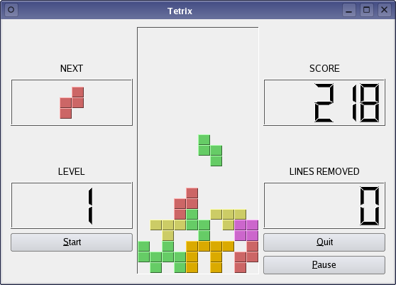 Apart from the setNextPieceLabel() function and the start() and pause() public slots, we only provide public functions to reimplement QWidget::sizeHint() and QWidget::minimumSizeHint(). The signals are used to communicate changes to the player's information to the TetrixWindow instance.