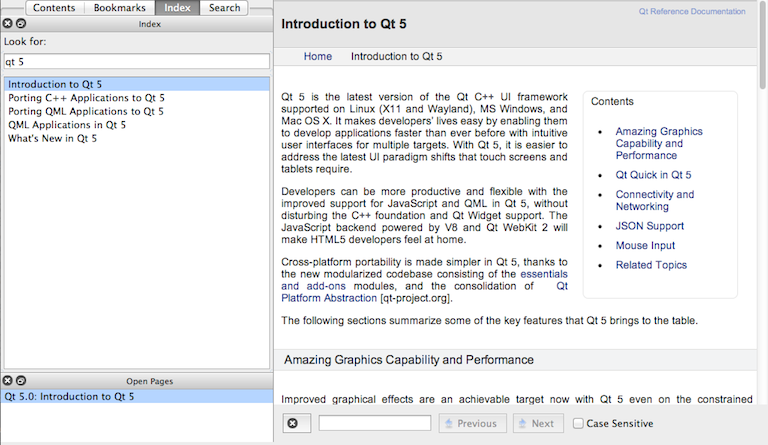 Qt Assistant allows you to install any kind of documentation as long as it is organized in Qt compressed help files (*.qch). For example, you can view Qt reference documentation for several Qt versions at the same time. In many respects, this is very convenient since only one version of Qt Assistant is needed. However, at the same time it becomes more complicated when performing tasks like searching the index because most keywords are defined in more than one Qt version. This means that Qt Assistant will always ask the user to choose which one should be displayed.
