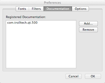 Click the Install button and choose the path of the compressed help file (*.qch) you would like to install. To delete a help file, select a documentation set in the list and click Remove.