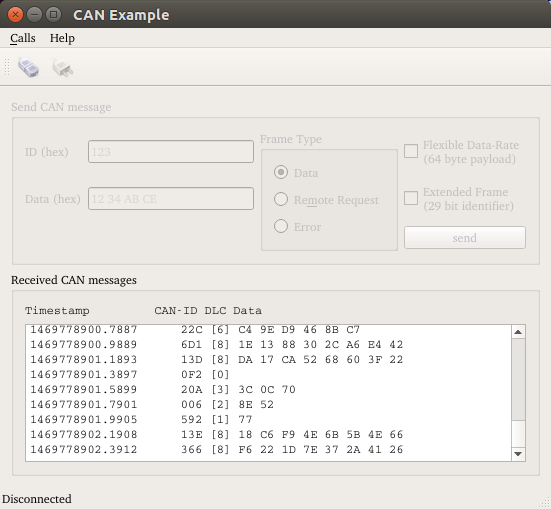 The example sends and receives CAN bus frames. Incoming frames are ordered according to their type. A connect dialog is provided to adjust the CAN Bus connection parameters.