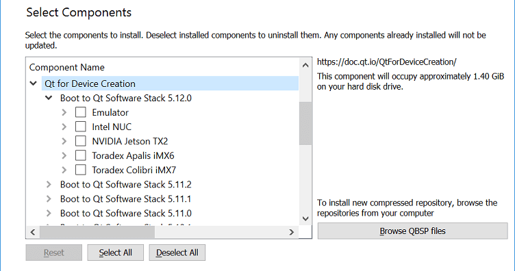 Note: Building the Boot to Qt system image and toolchain are not supported on Windows. Thus the sources of the Boot to Qt software stack are available only via the Linux online installer.
