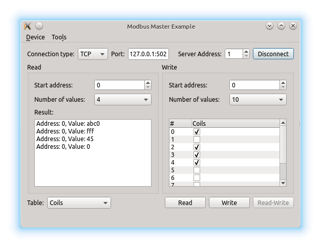 The example must be used in conjunction with the Modbus Slave example or another Mobus device which is either connected via TCP or Serial Bus.