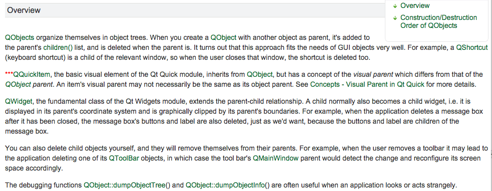 The link is marked with three red asterisks. Now you can click on the actual link to check that it goes to the correct place. In this case, the link should go to the reference page for the QQuickItem class. You can check each link in the table this way. If you find a link that goes to the wrong place, use the source file name and line number to find the link, and fix the problem using the square bracket notation for the \l command.