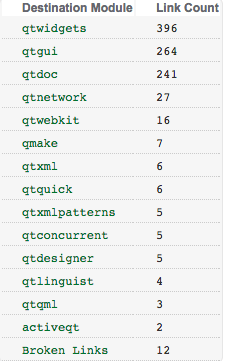 Each table entry shows the number of links from QtCore to some other module, except for the last entry, which shows the number of broken links in QtCore. Click the qtquick entry to load the QA subpage showing the links from QtCore to QtQuick.