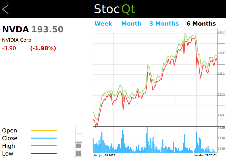 Rectangle { id: chart ... Canvas { id: canvas ... onPaint: { numPoints = stockModel.indexOf(chart.startDate); if (chart.gridSize == 0) chart.gridSize = numPoints var ctx = canvas.getContext("2d"); ctx.globalCompositeOperation = "source-over"; ctx.lineWidth = 1; drawBackground(ctx); if (!stockModel.ready) { drawError(ctx, "No data available."); return; } var highestPrice = 0; var highestVolume = 0; var lowestPrice = -1; var points = []; for (var i = numPoints, j = 0; i >= 0 ; i -= pixelSkip, j += pixelSkip) { var price = stockModel.get(i); if (parseFloat(highestPrice) < parseFloat(price.high)) highestPrice = price.high; if (parseInt(highestVolume, 10) < parseInt(price.volume, 10)) highestVolume = price.volume; if (lowestPrice < 0 || parseFloat(lowestPrice) > parseFloat(price.low)) lowestPrice = price.low; points.push({ x: j * xGridStep, open: price.open, close: price.close, high: price.high, low: price.low, volume: price.volume }); } if (settings.drawHighPrice) drawPrice(ctx, 0, numPoints, settings.highColor, "high", points, highestPrice, lowestPrice); if (settings.drawLowPrice) drawPrice(ctx, 0, numPoints, settings.lowColor, "low", points, highestPrice, lowestPrice); if (settings.drawOpenPrice) drawPrice(ctx, 0, numPoints,settings.openColor, "open", points, highestPrice, lowestPrice); if (settings.drawClosePrice) drawPrice(ctx, 0, numPoints, settings.closeColor, "close", points, highestPrice, lowestPrice); drawVolume(ctx, 0, numPoints, settings.volumeColor, "volume", points, highestVolume); drawScales(ctx, highestPrice, lowestPrice, highestVolume); } } Text { id: fromDate color: "#000000" font.family: Settings.fontFamily font.pointSize: 8 Layout.alignment: Qt.AlignLeft text: "| " + startDate.toDateString() } Text { id: toDate color: "#000000" font.family: Settings.fontFamily font.pointSize: 8 Layout.alignment: Qt.AlignRight Layout.rightMargin: canvas.tickMargin Layout.columnSpan: 5 text: endDate.toDateString() + " |" } } }