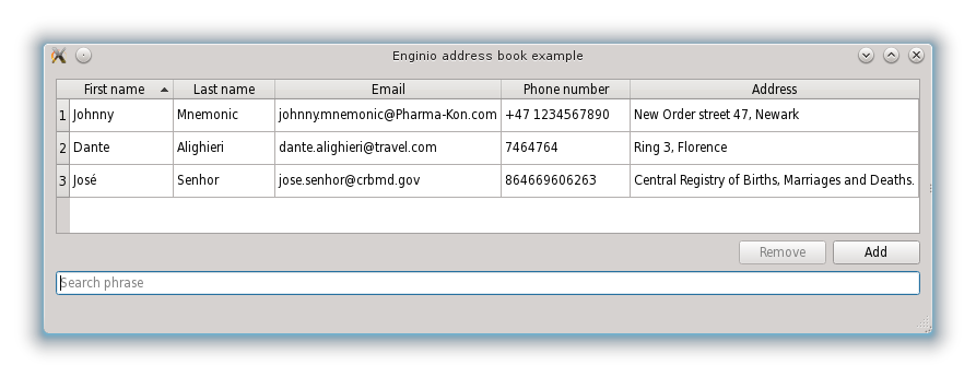 This example explains how to use the full text search feature of Enginio, and how to sort and filter data showed from the EnginioModel. A simple addressbook-like application will be created to illustrate this. This example doesn't cover security or multi-user management. For such topics, please refer to the Social Todo example.