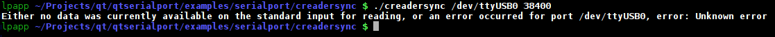 Command Line Reader Sync shows how to use the QSerialPort class for receiving data synchronously over the selected serial port with the desired settings.