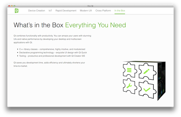 In oneqt.qml, we build the 2D content as normal in QML. Then we add a custom ImageCube type into the scene behind the text elements. This custom type, implemented using three.js library, handles the painting of the 3D cube.