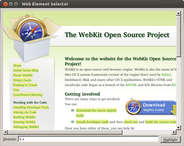 When the application's event loop is run, the WebKit home page will load, and the user can then begin to start running queries against the contents of the page. The highlighting can only be removed by reloading the page. To do this, open a context menu over the page and select the Reload menu item.
