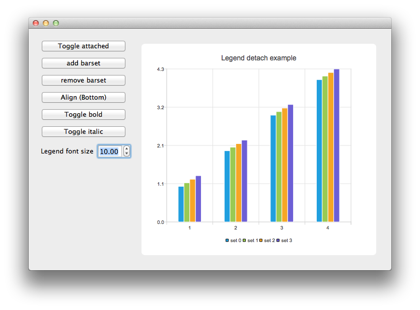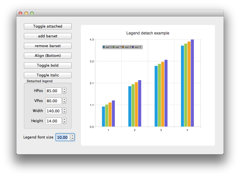 By default the chart draws the legend inside the same view with the chart. In some cases the user may want to draw the legend to somewhere else. To make this possible the legend can be detached from the chart. Detaching means that the chart doesn't draw the legend or try to change its layout. Detached legend can then be drawn wherever the user wishes, for example, in a different graphics scene. The behavior of the legend can be inspected by running the legend example. In the example we use the bar series where we add or remove the bar sets. The legend reflects the changes in series. The legend can be detached or attached back to the chart and its alignment can be modified. When the legend is detached, it can be resized and positioned freely.