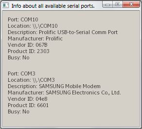 Enumerator shows how to use the class QSerialPortInfo for getting information about serial devices that are present in the system.