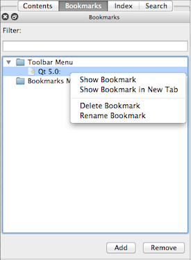 To bookmark topics of particular interest, select Bookmarks > Add Bookmark (or press Ctrl+B). A bookmark for the page that is currently showing in the Documentation window is added.