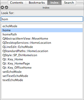 To perform an index search, click the Index tab on the sidebar (or press Alt+I). In the Look For field, enter the search term. As you type, words are found and highlighted in a list beneath the field. If the highlighted text matches what you are looking for, double-click it or press Enter. The Documentation window displays the relevant topic. You rarely have to type in the whole word before Qt Assistant finds a match. Note that for some words there may be more than one possible topic that is relevant.