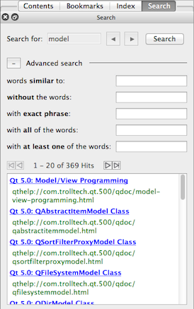 Qt Assistant also provides full text searching for finding specific words in the documentation. To activate the full text search, either press (Alt+S) or click the Search tab on the sidebar. Then enter the term you are looking for and click Search. All documents containing the specified term are listed.