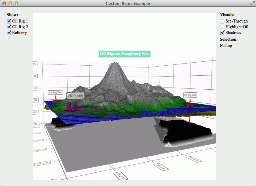 The custom items example shows how to add your own custom meshes as items to a graph, and how to remove them.