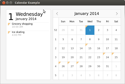 The Calendar example displays a Calendar control and an events list for the selected date. It uses a C++ class to fetch the event details from an SQLite database. The example app uses a custom CalendarStyle to highlight the selected date and mark the dates that have events.